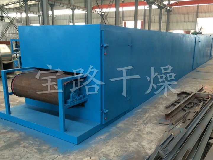 物料由加料器均勻地鋪在網帶上,網帶一般采用12-60目不銹鋼絲網,由傳動裝置拖動在干燥機內移動。干燥機由若干單元組成,每一單元熱風獨立循環,部分尾氣由專門排濕風機排出,廢氣由調節閥控制,熱氣由下往上或由上往下穿過鋪滿物料的網帶完成熱量與質量傳遞的進程,帶走物料水份。網帶緩慢移動,運行速度可根據物料溫度自由調節,干燥后的成品連續落入收料器中。上下循環單元根據用戶需要可靈活配備,單元數量亦可根據需要選取。