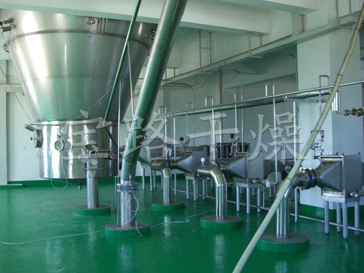 該生產(chǎn)線由供料系統(tǒng)、介質(zhì)循環(huán)系統(tǒng)、空氣加熱凈化系統(tǒng)、干燥塔系統(tǒng)、收料系統(tǒng)、控制系統(tǒng)等多個(gè)系統(tǒng)整合而成。主塔系統(tǒng)集中了目前噴霧干燥工程的所有尖端技術(shù),噴干機(jī)組的收料系統(tǒng)由一級(jí)旋風(fēng)分離器+布袋除塵器組合形成。一級(jí)旋風(fēng)采用高氣量高效率旋風(fēng)進(jìn)行收集,其收粉率能達(dá)到96%左右分,而布袋除塵器是針對(duì)蛋白粉類除塵專門設(shè)計(jì)的優(yōu)化設(shè)備,能使物料與風(fēng)進(jìn)行完全分離并沉降,布袋為拒水防油防靜電布袋,過(guò)濾目數(shù)可達(dá)500目以上。